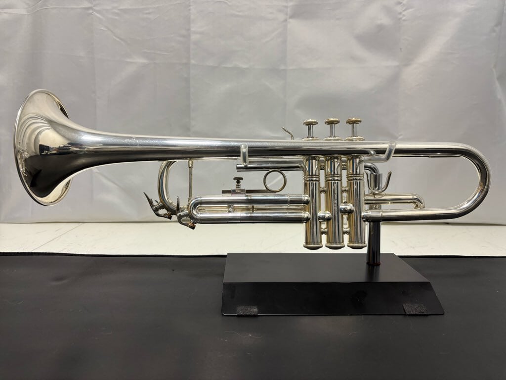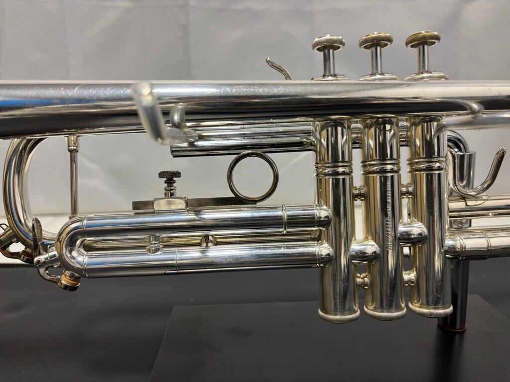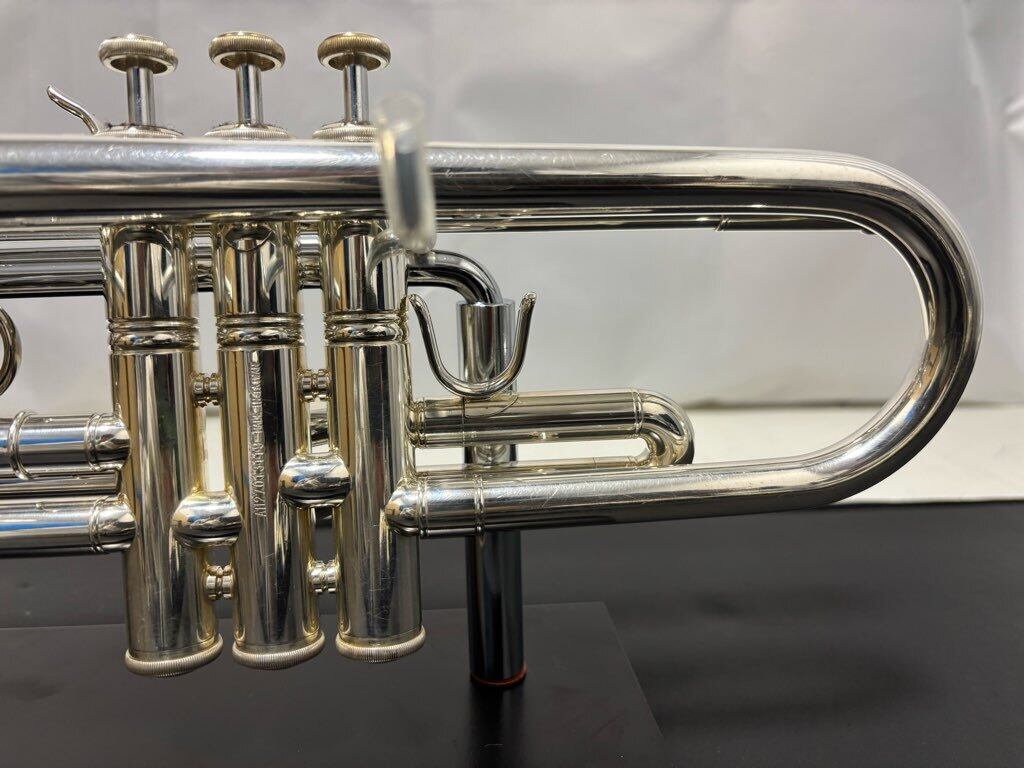 イエローブラス製の材質、1本支柱、銀メッキ仕上げ等、トランペットの基本的な仕様で非常にバランスの取れた楽器ですので、初心者から中級者の方まで、広く対応できる楽器です♪